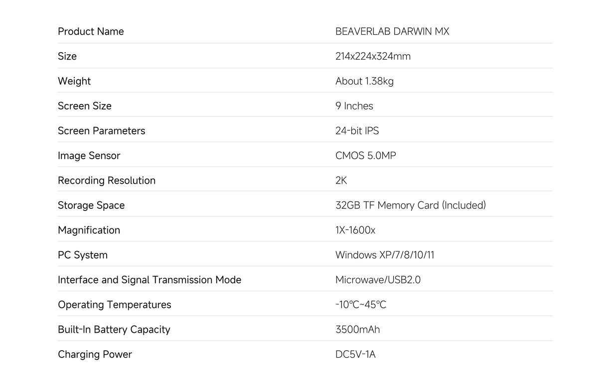 The Darwin MX features a multi-head microscope-style design, equipped with three sets of objective lenses at 100X, 600X, and 1200X. Equipped with a 5-megapixel Sony CMOS sensor, Darwin MX has excellent image capturing and processing capabilities, capable of outputting videos and photos with a resolution of 2560×1920, providing you with a high-quality visual experience.